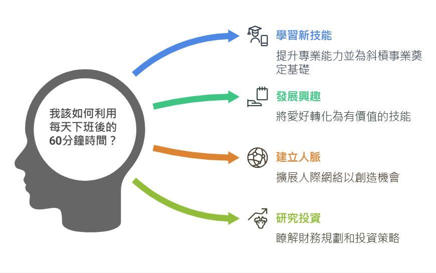 不妨試著將每天下班後的時間重新分配,撥出固定的 60 分鐘投資自己吧!你會發現這看似微小的行動,長期累積下來將會產生驚人的效果。